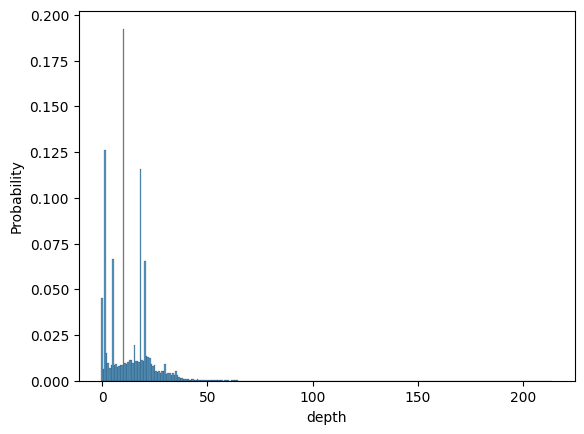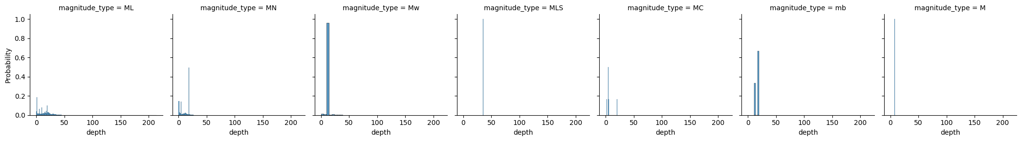 g.map(sns.histplot, 'depth', stat='probability')<class 'pandas.core.frame.DataFrame'>
