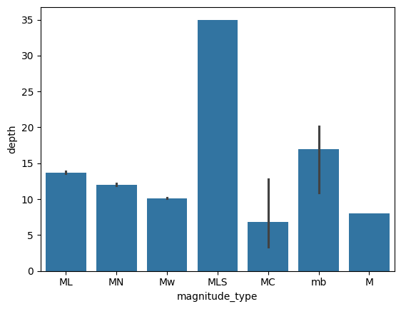 sns.barplot(x='magnitude_type', y='depth', data=earthquake)