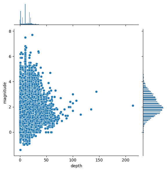 sns.jointplot(x='depth', y='magnitude', data=earthquake)