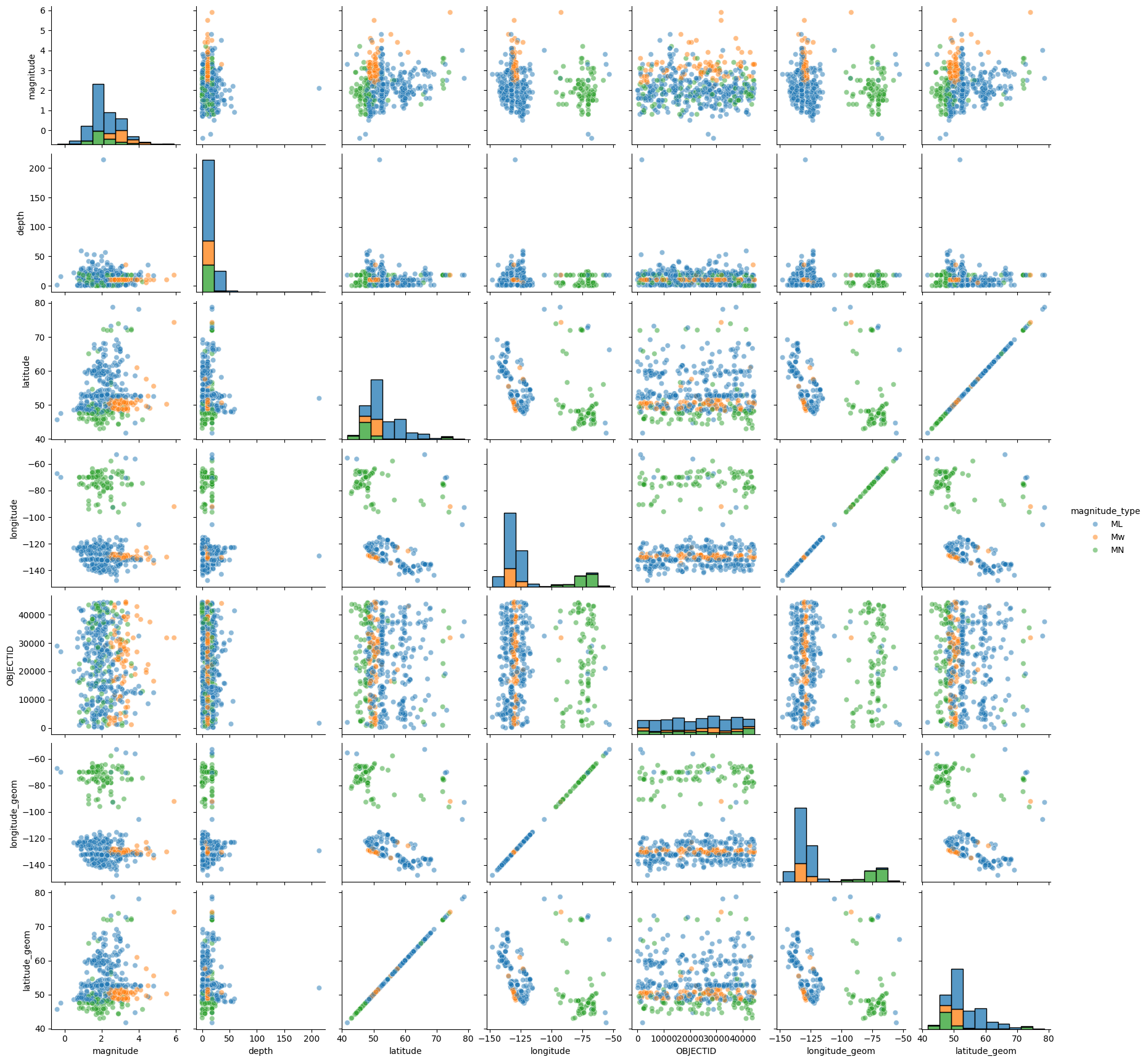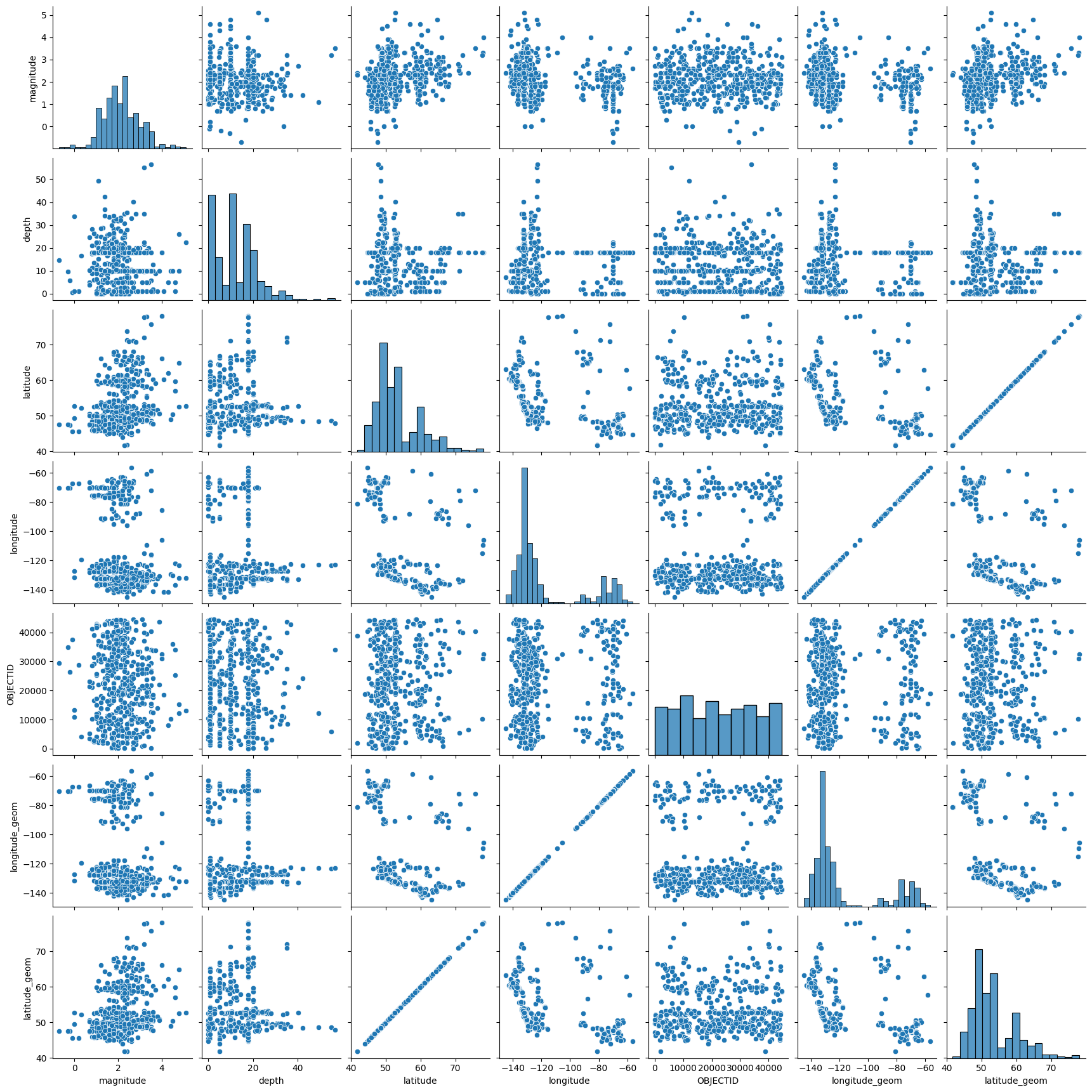 earthquake.describe()| magnitude | depth | latitude | longitude | OBJECTID | longitude_geom | latitude_geom | |